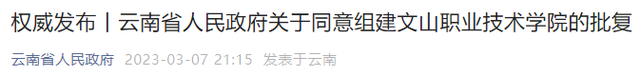 《云南省教育厅关于组建文山职业技术学院的请示》(云教报〔2023〕10号)收悉。经研究,现批复如下: